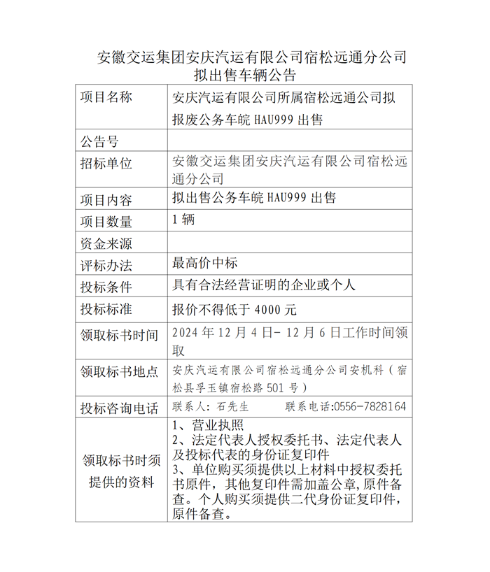 宿松遠通分公司擬出售車(chē)輛公告