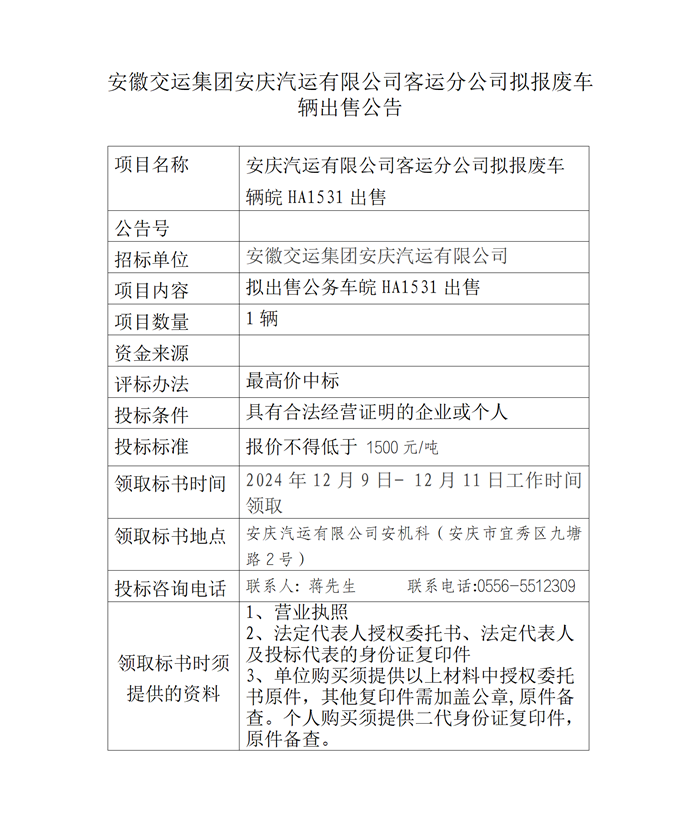 安慶汽運有限公司客運分公司擬報廢車(chē)輛出售公告